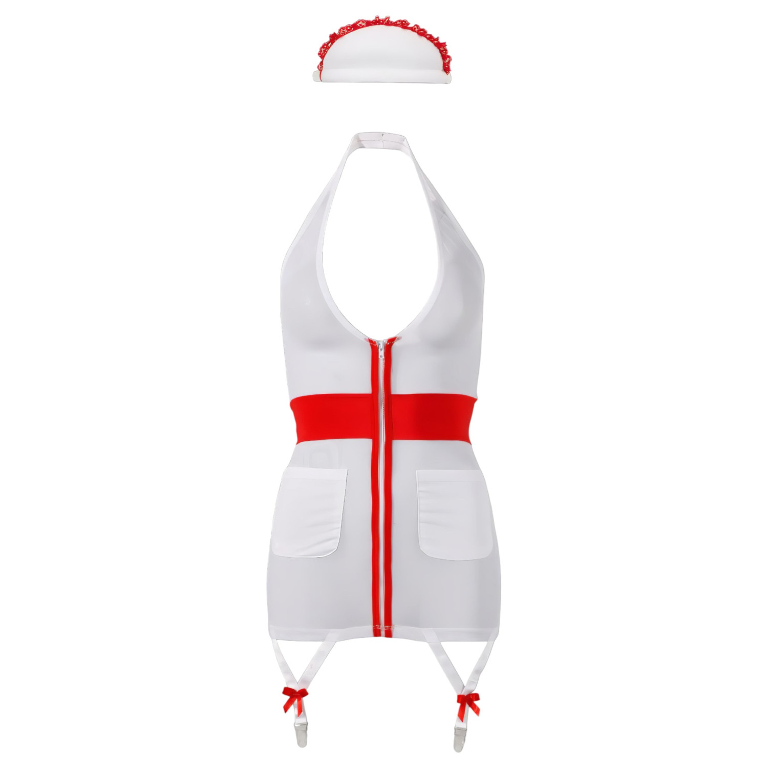 • 1 komad fleksibilne, prozirne mini haljine s patentnim zatvaračem i podvezicama